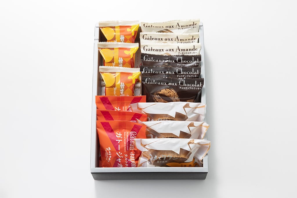 化粧箱入 ●タルトタタンのキャラメルナッツ×3 ●タルトタタンのガトージャポネ×3 ●アーモンドのクッキー×3 ●チョコチップのクッキー×3 ●米粉ガレット×3