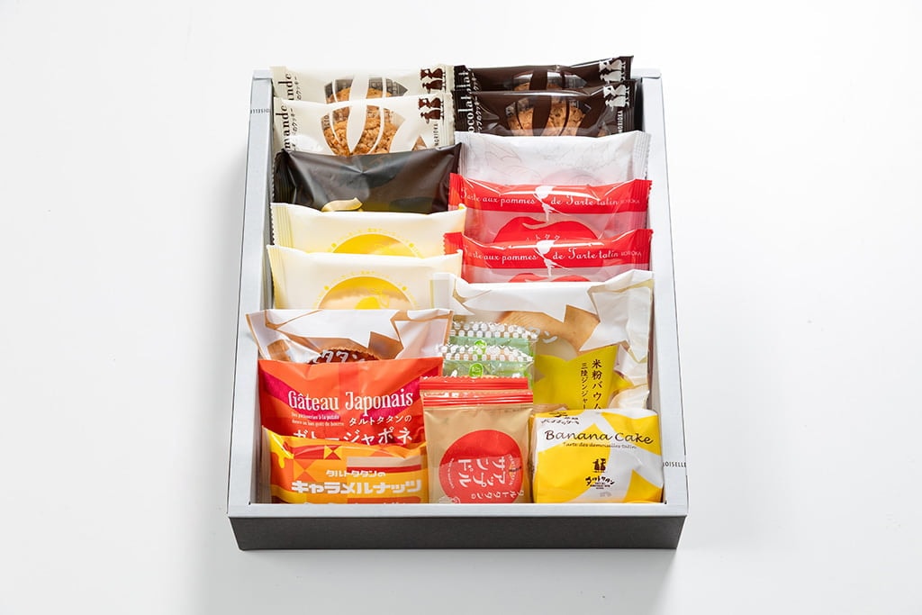 化粧箱入 ●アーモンドのクッキー×2 ●タルトタタンのガトゥショコラ×1 ●レモンケーキ×2 ●米粉ガレット×1 ●タルトタタンのガトージャポネ×1 ●タルトタタンのキャラメルナッツ×1 ●チョコチップのクッキー×2 ●ほっくりマロン×1 ●タルトタタンのアップルパイ×2 ●米粉バウム×1 ●タルトタタンのアップルサンド×2 ●タタンサブレ×2 ●茶畑バナナのケーキ×1