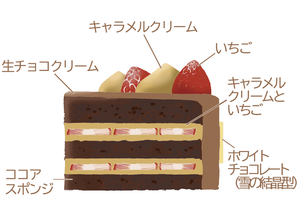 ココアスポンジに濃厚キャラメルと生チョコクリーム。苺をサンドした、甘みと酸味の絶妙バランスが特別な日を飾る贅沢な美味しさ。