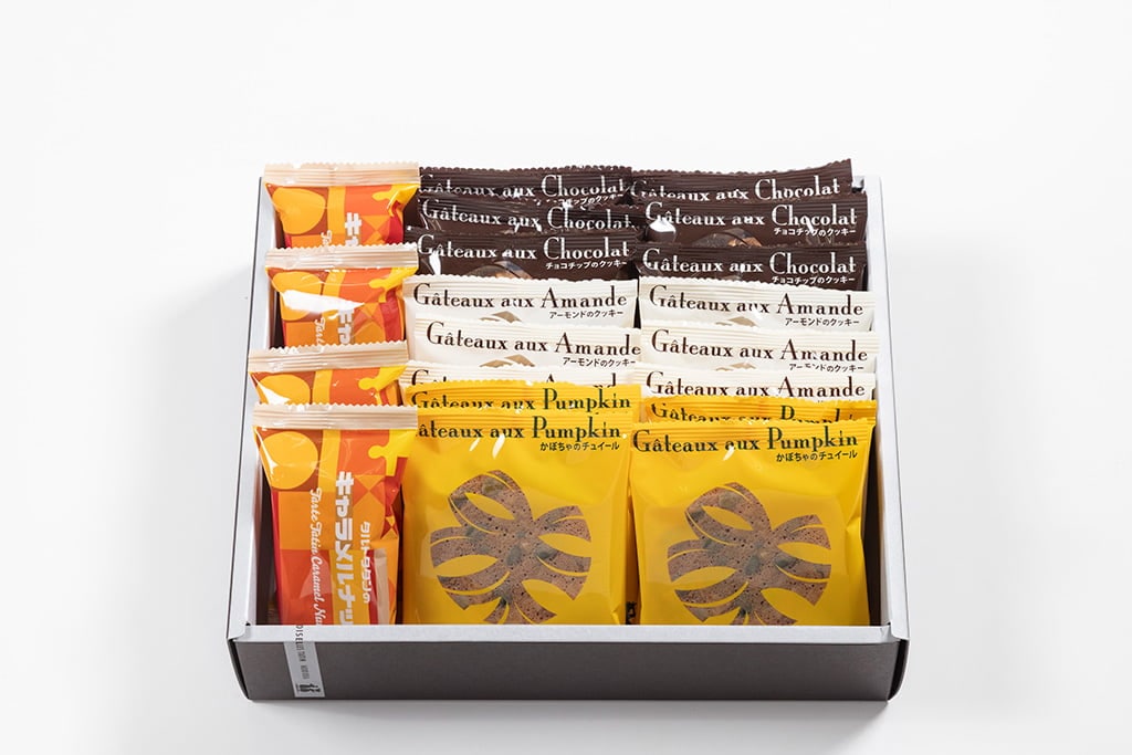 ●アーモンドのクッキー×6 ●チョコチップのクッキー×6 ●かぼちゃのチュイール×4 ●タルトタタンのキャラメルナッツ×4