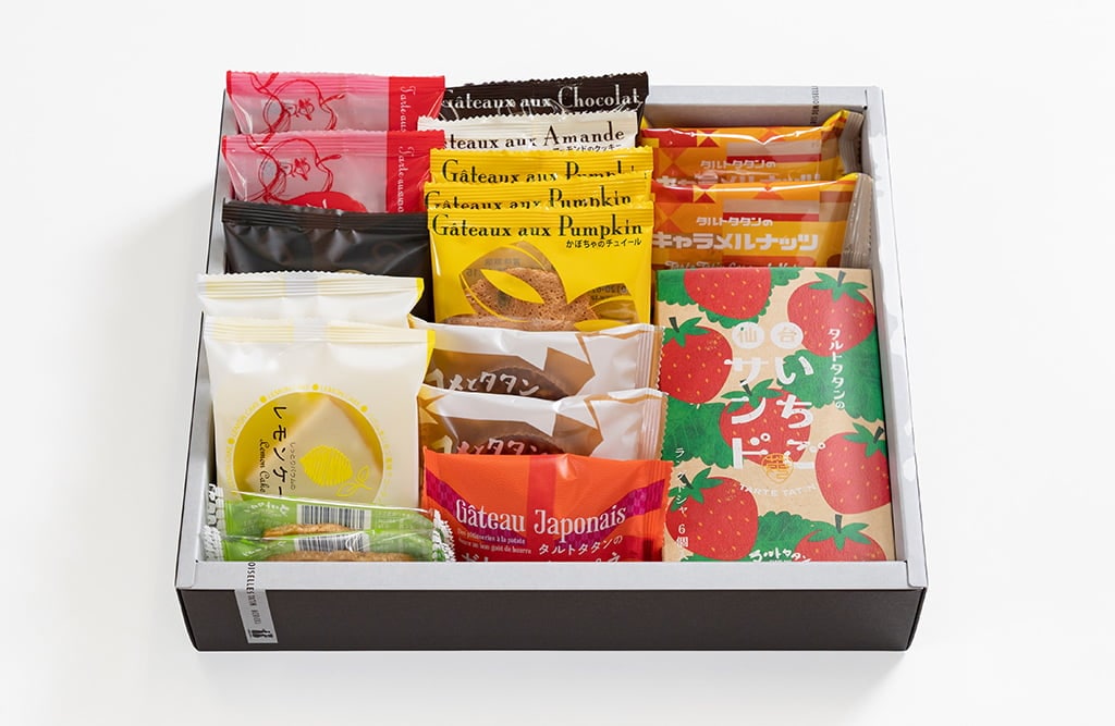 化粧箱入 ●タルトタタンのアップルパイ×2 ●タルトタタンのガトゥショコラ×1 ●レモンケーキ×2 ●タタンサブレ×2 ●チョコチップのクッキー×1 ●アーモンドのクッキー×1 ●かぼちゃのチュイール×3 ●米粉ガレット 焙煎玄米ときゃらめる×2 ●タルトタタンのガトージャポネ×1 ●タルトタタンのキャラメルナッツ×2 ●タルトタタンの仙台いちごサンド(6枚入)×1